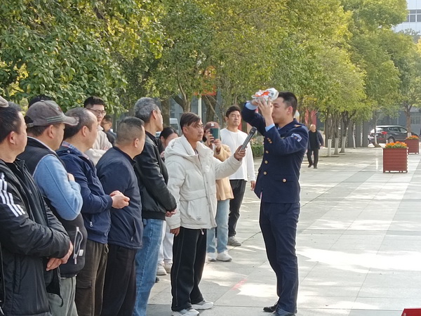 在“灭火实战区”,消防教官现场演示了干粉灭火器“提、拔、握、压”四步操作法,并手把手指导参训人员分组进行油盆灭火实战。面对熊熊火焰,大家沉着冷静、动作规范,迅速将火势扑灭。教官对操作中存在的问题逐一纠正点评,确保人人过关、技能到位。
