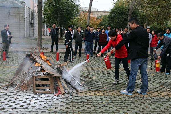 在示范完如何使用灭火器后,黄银章老师示范了如何正确使用消防栓。保卫处的消防队员铺开消防水带,打开消防栓后,一股高压水流喷出,迅速扑灭了远处的火苗。在场者按照指导亲身体验了消防栓的使用过程。