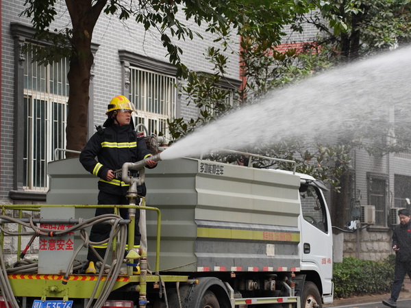 演练现场,校消防救援小分队在接警后3分钟内即全副武装抵达,队员们分工明确、配合娴熟:两名队员从火场不同方位精准喷射水雾,对起火区域及周边车辆进行降温压制;另一名队员则迅速进入火场内部,抢救转移未受损车辆,有效防止了火势的扩大蔓延。2分钟后,联动洒水车到达现场,利用其高扬程水枪进行高空喷射,对车棚进行全覆盖式降温灭火。整个处置过程衔接紧密、一气呵成,火情被迅速扑灭。